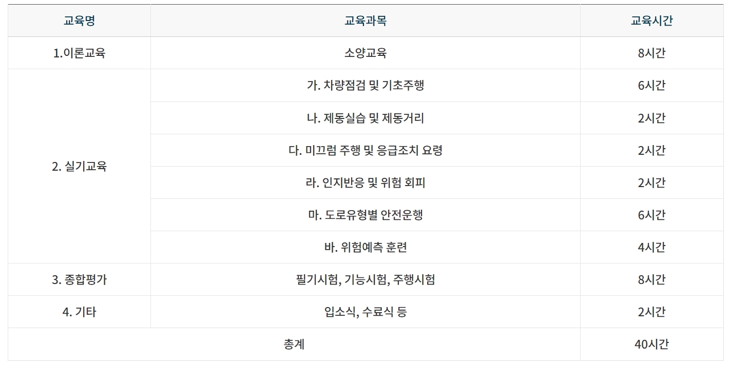 5일 동안 총 40시간의 교육일정으로 진행됩니다. 이론 교육은 8시간, 실기교육의 경우 22시간, 종합 평가가 8시간, 기타 2시간입니다. 아래 표를 참고하시어 교육과정을 좀 더 확인해 보시기 바랍니다.