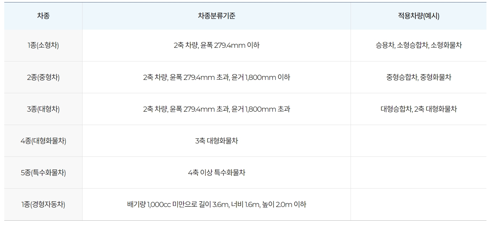 우리는 한국도로공사가 관리하는 요금소의 통행요금을 미리 확인할 수 있습니다. 어떤길로 가느냐에 따라 다를 수도 있고 차종에 따라 통행료가 달라지는 점 참고하시어 아래 표를 통해 내 차량이 어떤 차종으로 구분되는지 확인할 수 있습니다.