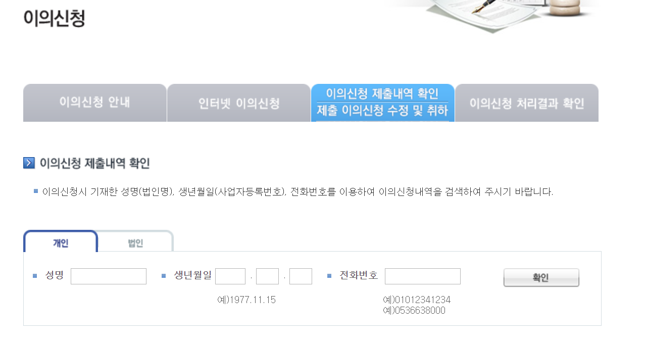 이의신청시 기재한 성명, 생년월일 또는 사업자등록번호, 연락처를 통해 내용을 검색해 보시기 바랍니다.