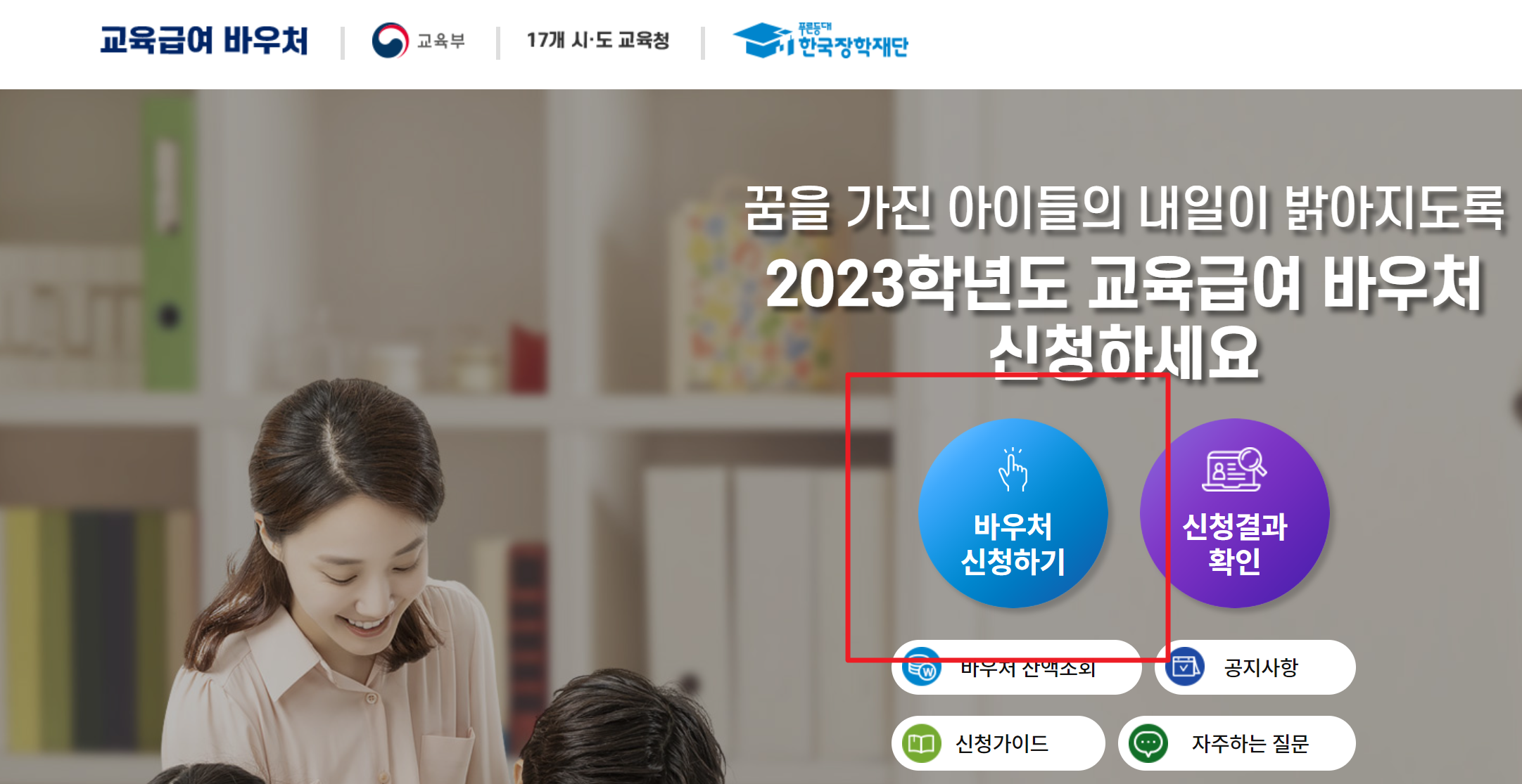 위 버튼을 클릭하시면 아래와 같은 교육급여 바우처 신청 페이지로 바로 이동합니다. 아래 빨간색 색인되어있는 영역을 클릭후 바우처를 신청해보시기 바랍니다.