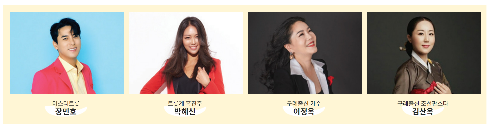 어린이 합창단, 구례 합창단, 호남 여성 농악 공연이 진행 후 개막식에서는 트로트 공연이 펼쳐집니다. 트로트 가수 장민호, 박해신, 김산옥, 이정옥의 무대로 개막식이 진행됩니다.