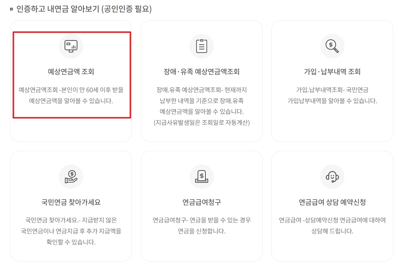 위 버튼을 클릭하시면 '내연금 알아보기' 페이지로 이동됩니다. 해당 페이지에서 아래색인되어있는 영역 클릭 시 수령나이와 더불어 내 연금의 예상 수령액까지 조회해볼 수 있습니다.