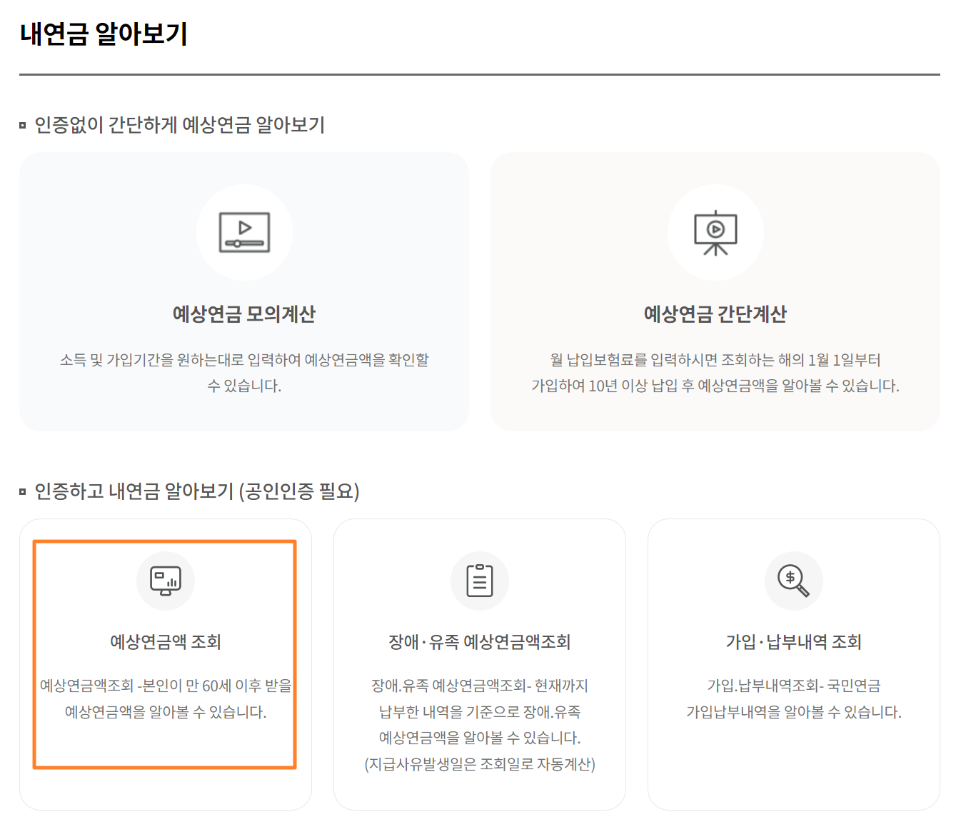 해당 예상연금액 조회의 경우에는 개인정보 등이 포함되어 있어 공인인증이 필요합니다.