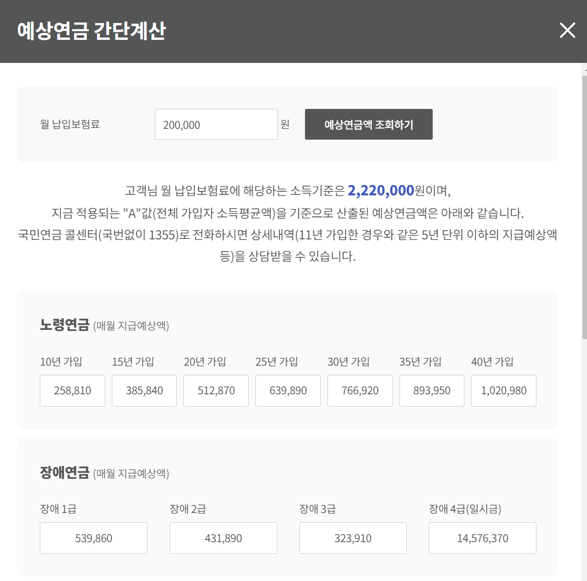 월 납입보험료는 보통 급여의 9% 가량인데요, 조회하는 해의 1월 1일부터 가입하여 10년 이상 납입할 경우 예상금액을 조회해볼 수 있습니다. 가입기간이 10년이 넘어야 수령받을 수 있기 때문인데요