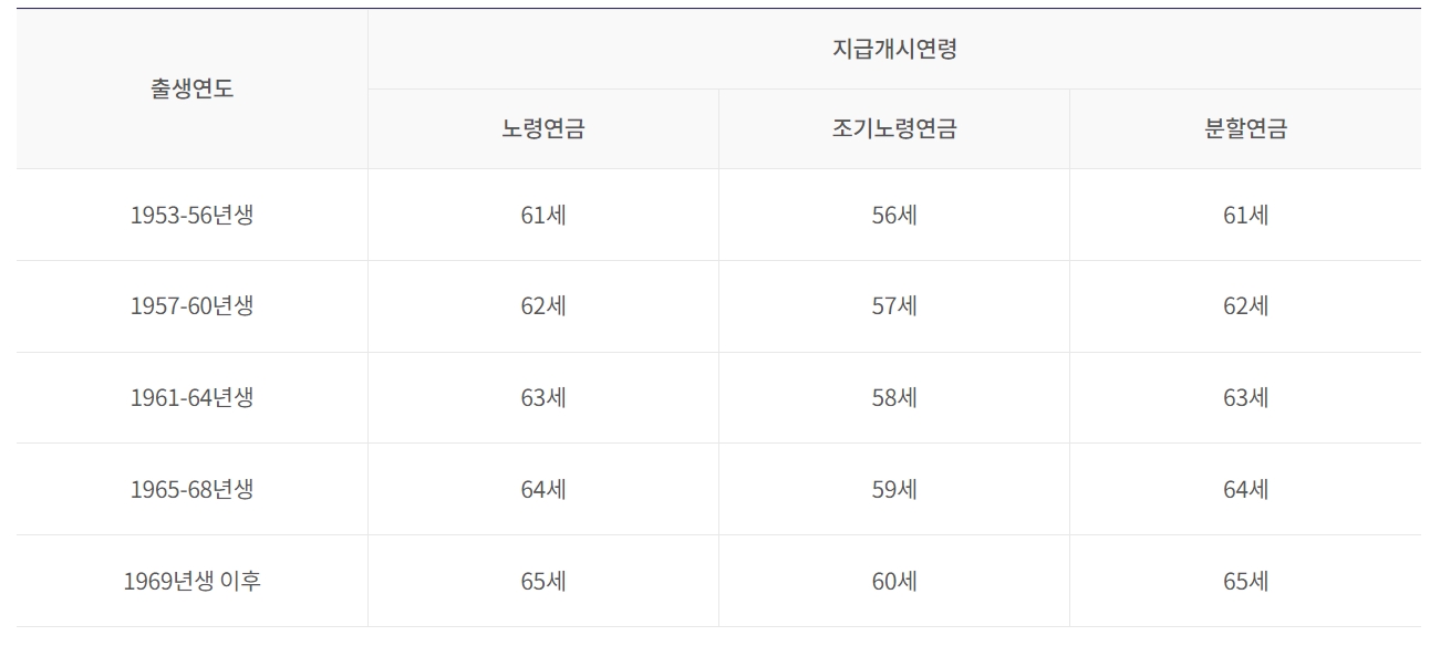 국민연금은 최소 10년 이상 납입한 사람만이 수령할 수 있으며 출생년도에 따라 수령나이가 달라지기 때문에 내 나이가 언제 국민연금 수령이 가능한지 아래 표를 참고하실 수 있습니다.
