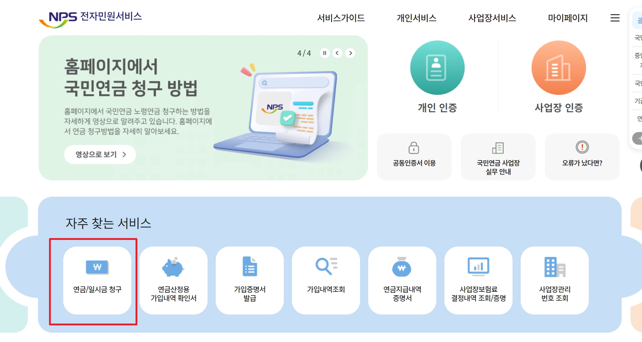 해당 홈페이지로 이동하셨다면, 연금/일시금 청구 버튼 클릭 후 본인인증을 통해 노령연금을 신청할 수 있습니다.