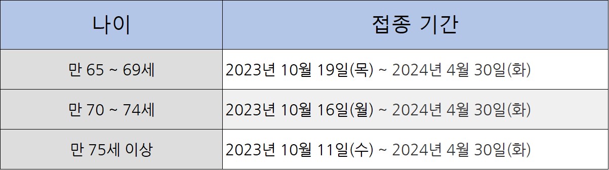 만 65세 이상일 경우 접종 기간이 구분되어 있으므로, 이에 해당하는 시기를 잘 참고하시어 병원에 내원하셔야 합니다. 아래 표를 통해 내 나이에 맞추어 접종 기간을 확인해보시기 바랍니다.