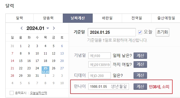 위 버튼을 클릭하시면 다음에서 제공하는 만나이 계산기로 이동합니다. 모두 생년월일을 기입할 경우 만 나이와 함께 띠를 확인해볼 수 있습니다.