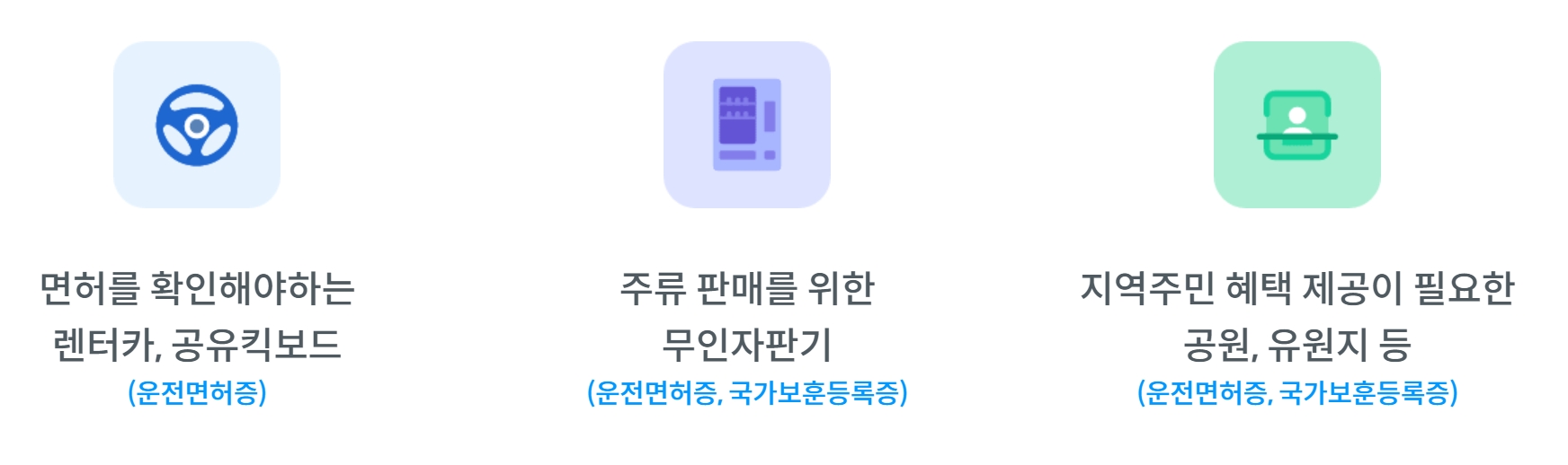 모바일 신분증은 편의점, 술집, 은행, 관공서 등에서 사용할수 있으며 앱 화면을 터치하는 것만으로도 손 쉽게 육안 확인 뿐 아니라 QR코드 등으로도 스캔하여 신분 확인이 가능합니다.