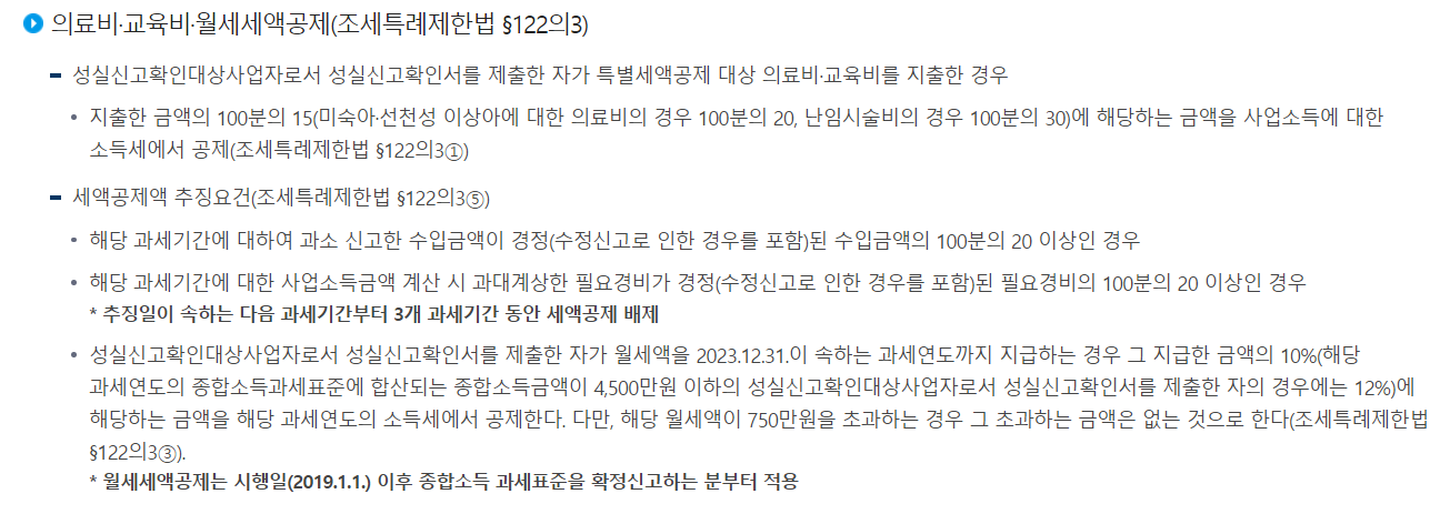 만약 성실신고 확인서를 제출할 경우 기타 비용 경비를 60%까지 공제해줄 뿐 아니라, 특별세액공제 대상 의료비, 교육비 등을 지출했을 경우 최대 30%의 세액 공제를 받을 수 있습니다.
