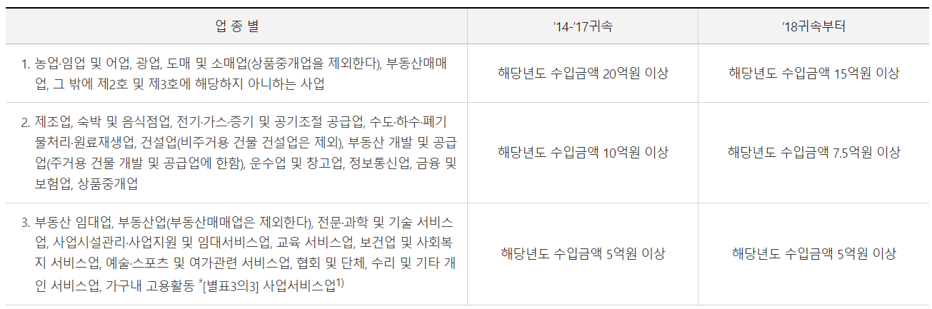 농업, 광업, 도소매업, 부동산 매매업 등 아래 업종별 수입 금액을 확인 후 내가 어떤 구간에 들어가는지 체크해보시기 바랍니다.