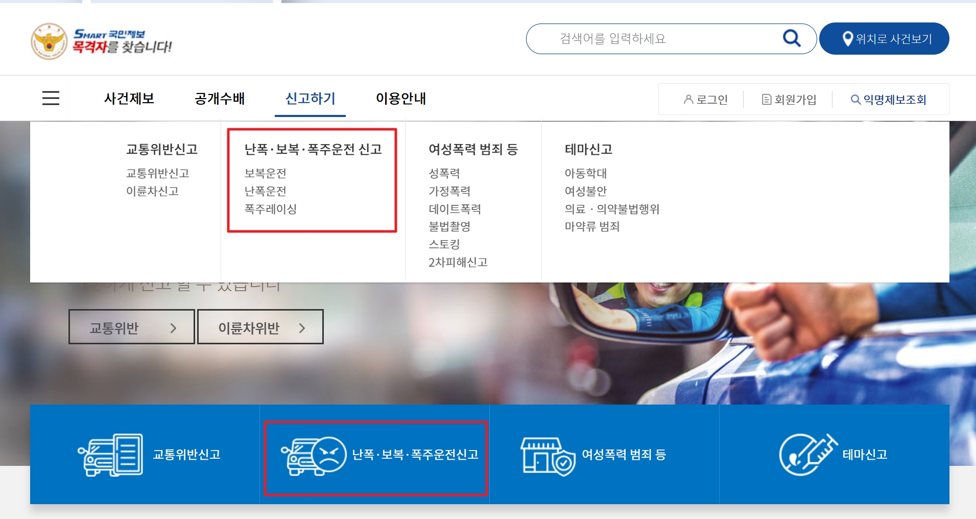 이와같이 도로상에서 위협을 가하는 경우 스마트 국민제보 홈페이지를 통해 신고할 수 있습니다.