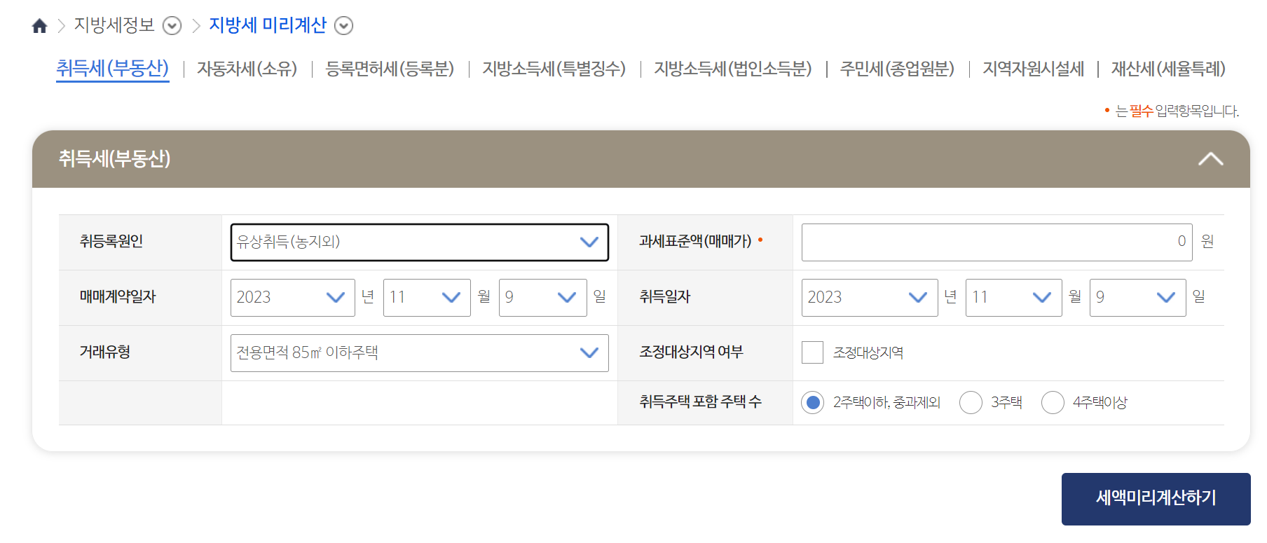 지방세 미리 계산 > 취득세(부동산) 에서 확인해볼 수 있는 취득세 계산기는 아래와 같이 생겼습니다. 어떤 항목들이 필요할까요?