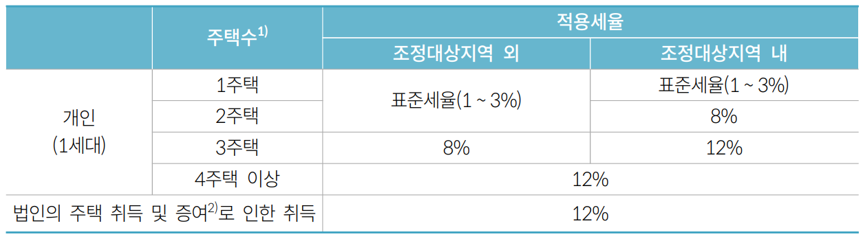 적용되는세율은 아래 표를 참고하시어 설명드릴텐데요, 주택수에 따라 가장 먼저 구분되며, 조정대상 지역 유무에 따라 표준세율이 적용되거나 더 높은 세율로 올라갈 수 있습니다.