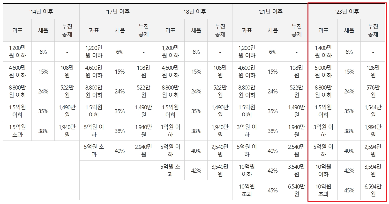 23년부터 적용되는 양도소득세율 표는 위에서 확인하실 수 있는데 6%에서 최고 45%의 세율이 매겨집니다.
