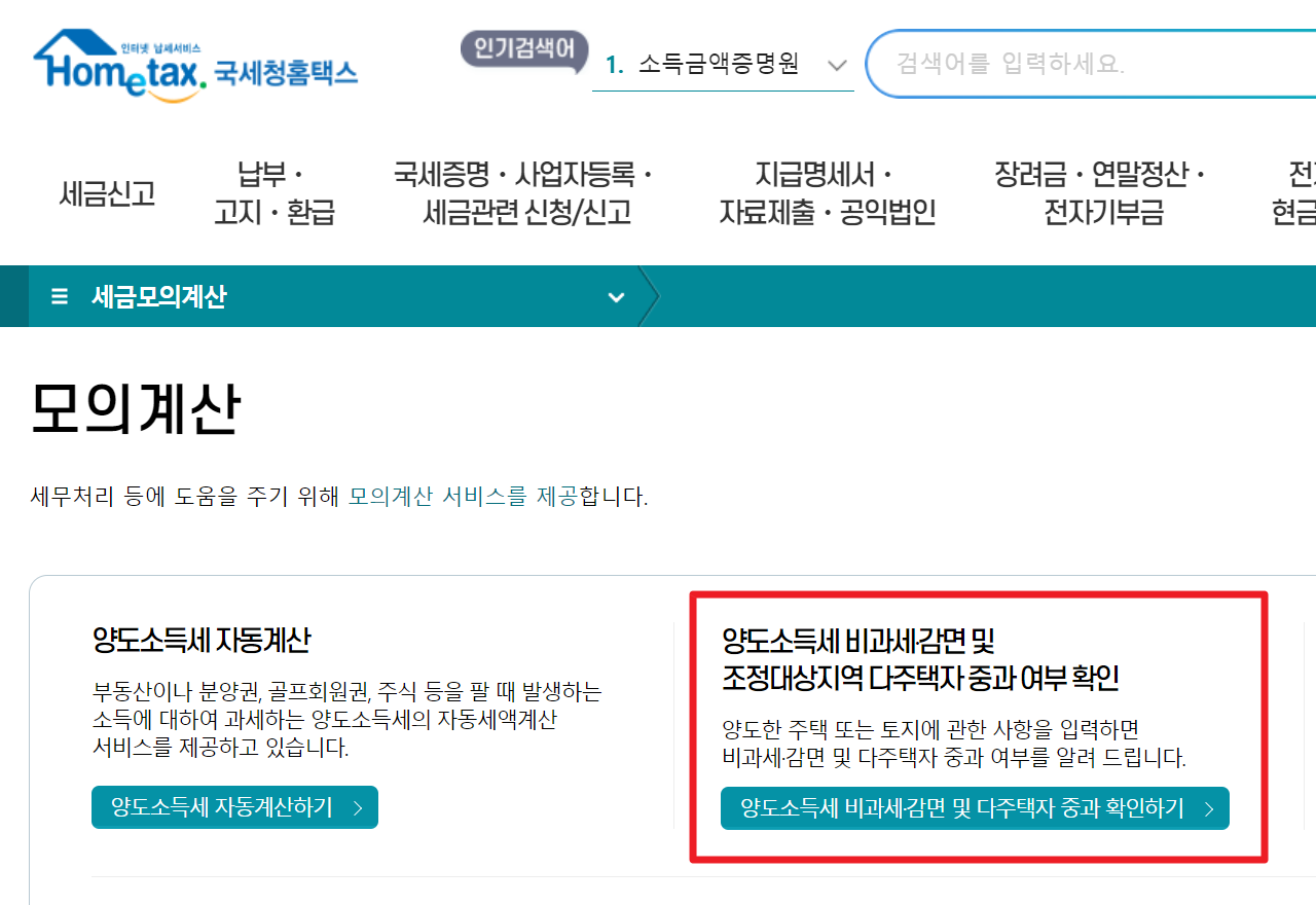 위 버튼을 클릭하시면 국세청 홈택스에서 제공하는 양도소득세 비과세 감면 및 다주택자 중과 여부를 확인해볼 수 있는 모의계산기로 이동합니다.