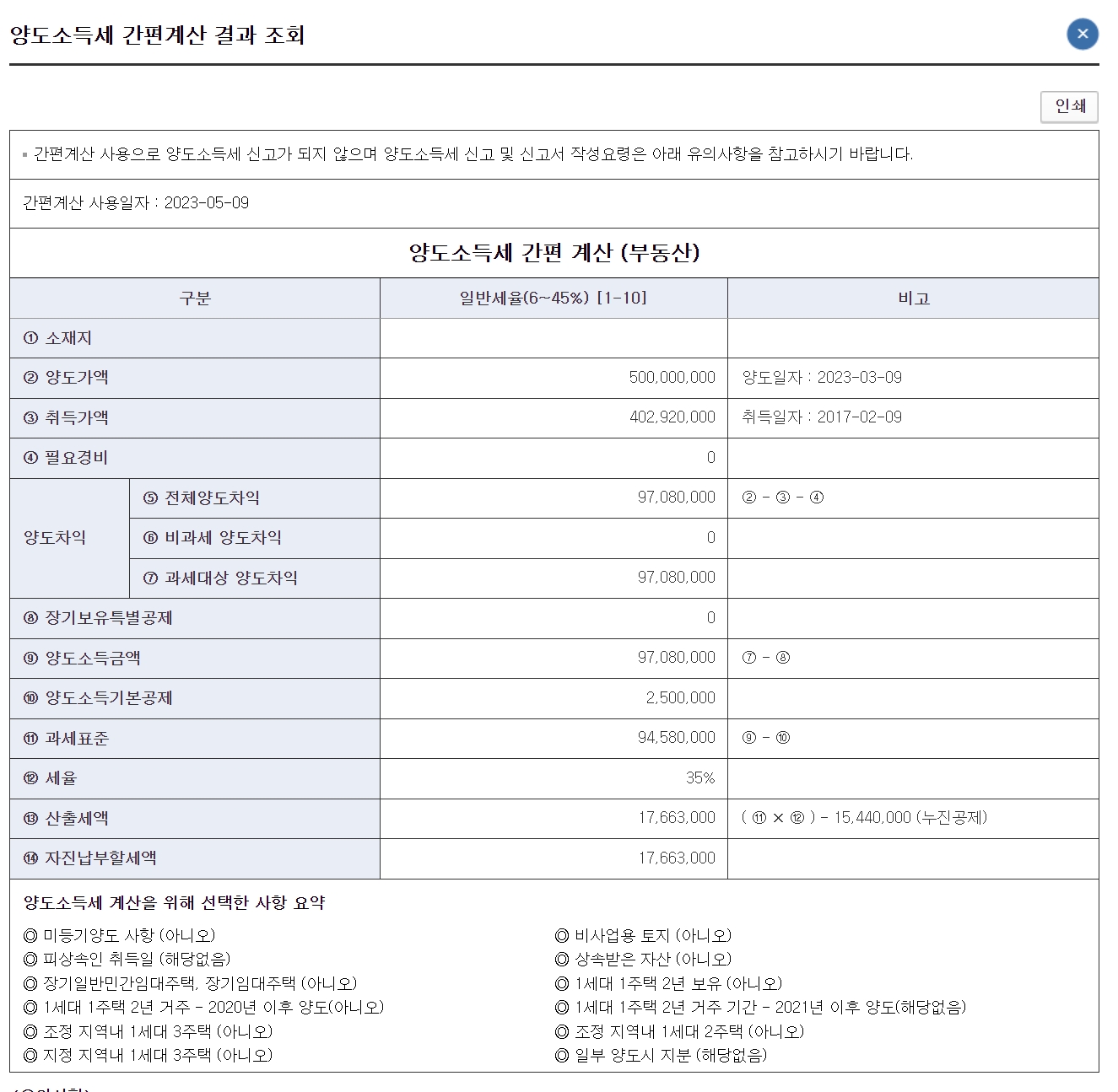 위 내용을 토대로 임의로 간편 계산 결과 조회내용을 확인해 보시기 바랍니다. 양도가액이 5억 이상이기 때문에 세율이 35% 적용되었으며 납부할 세액은 17,663,000원으로 결괏값이 산출되었습니다.