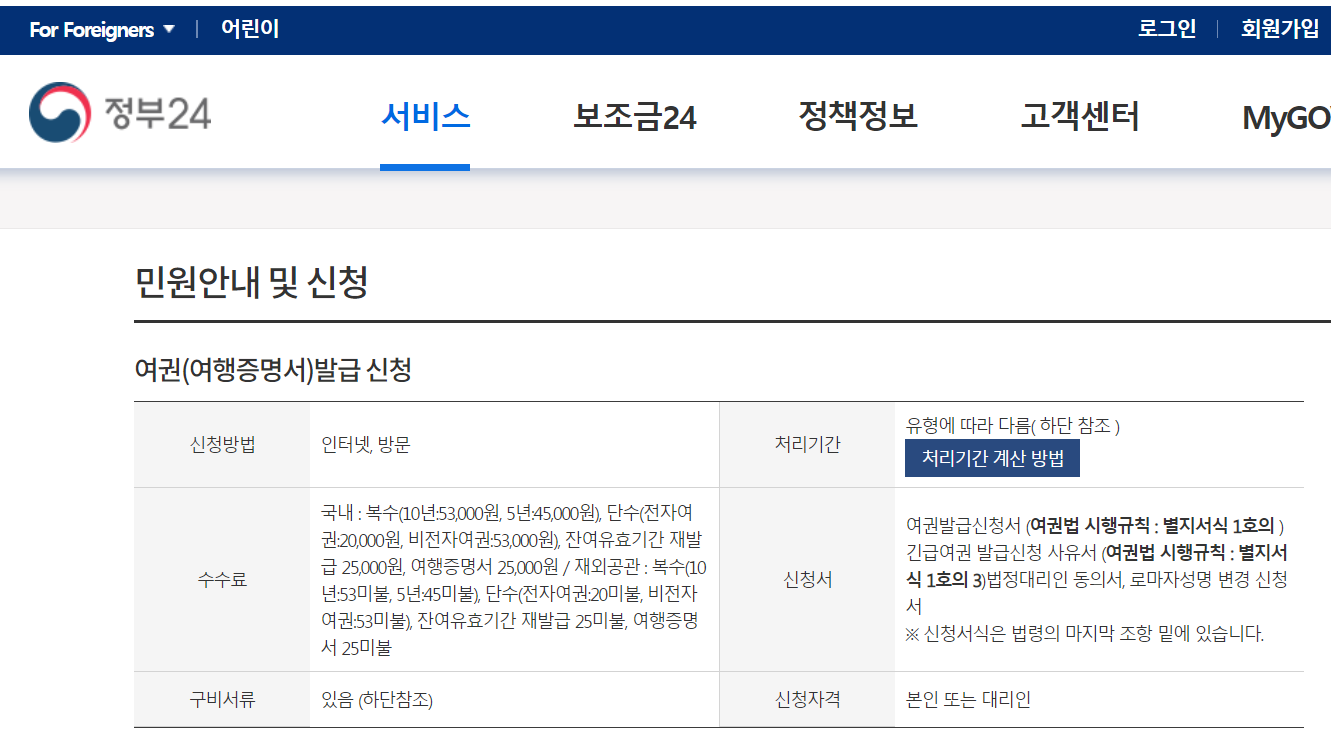 정부24 홈페이지에서는 여권 발급 신청서를 온라인으로 받고 있으며, 위 준비 서류를 지참하시어 신청해 보시기 바랍니다.