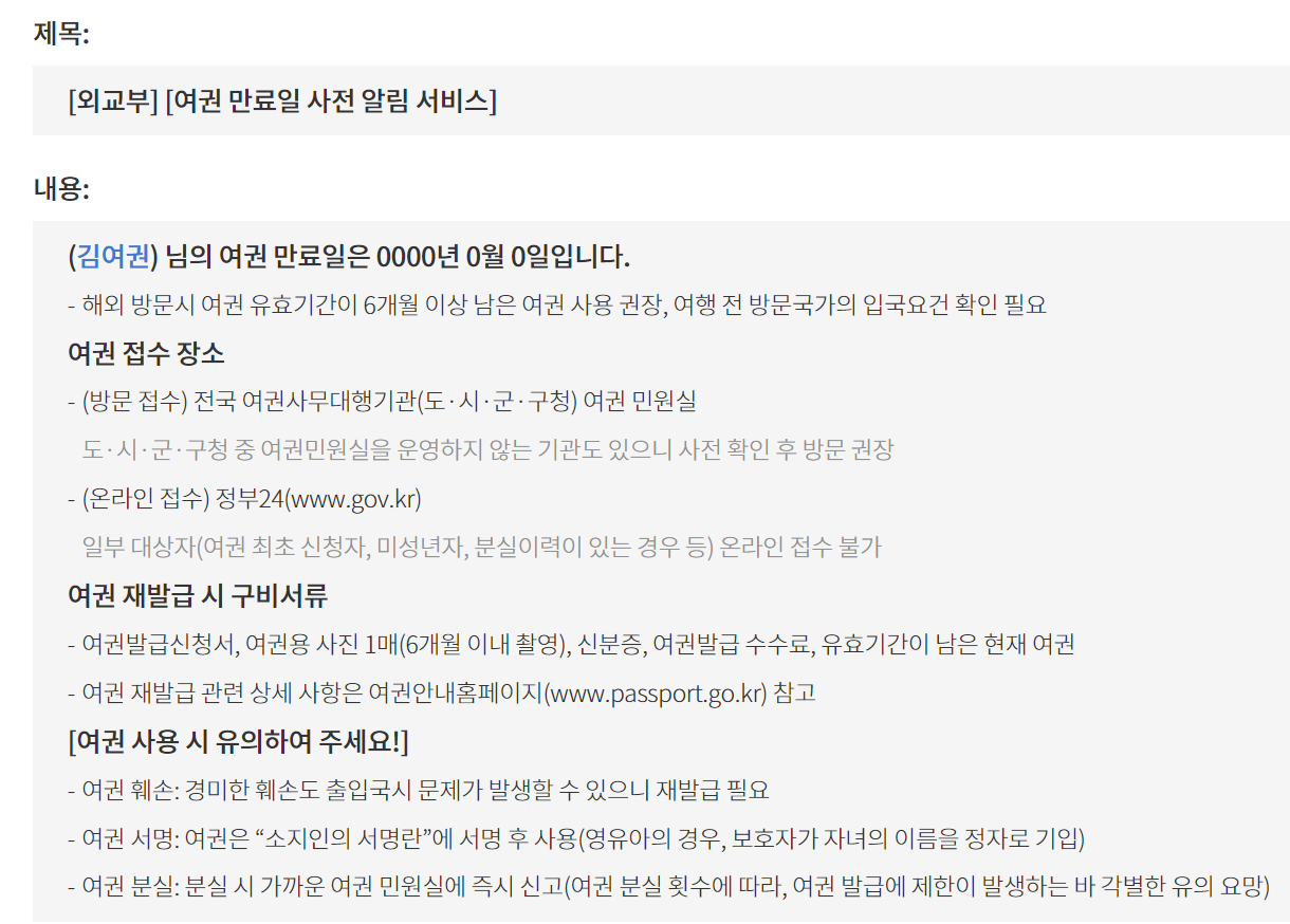 여권 유효기간 사전 알림 서비스를 등록할 경우 아래 이미지처럼 문자 알림이 오는 것을 확인할 수 있습니다.