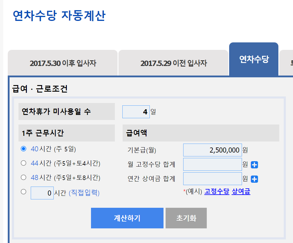연차수당 계산기 버튼을 클릭하면 노동ok에서 제공하는 연차수당 자동계산기로 이동되는데요, 기본급을 250만원으로 하고 연차 휴가 미사용일 수를 4일로 설정해 보았습니다.