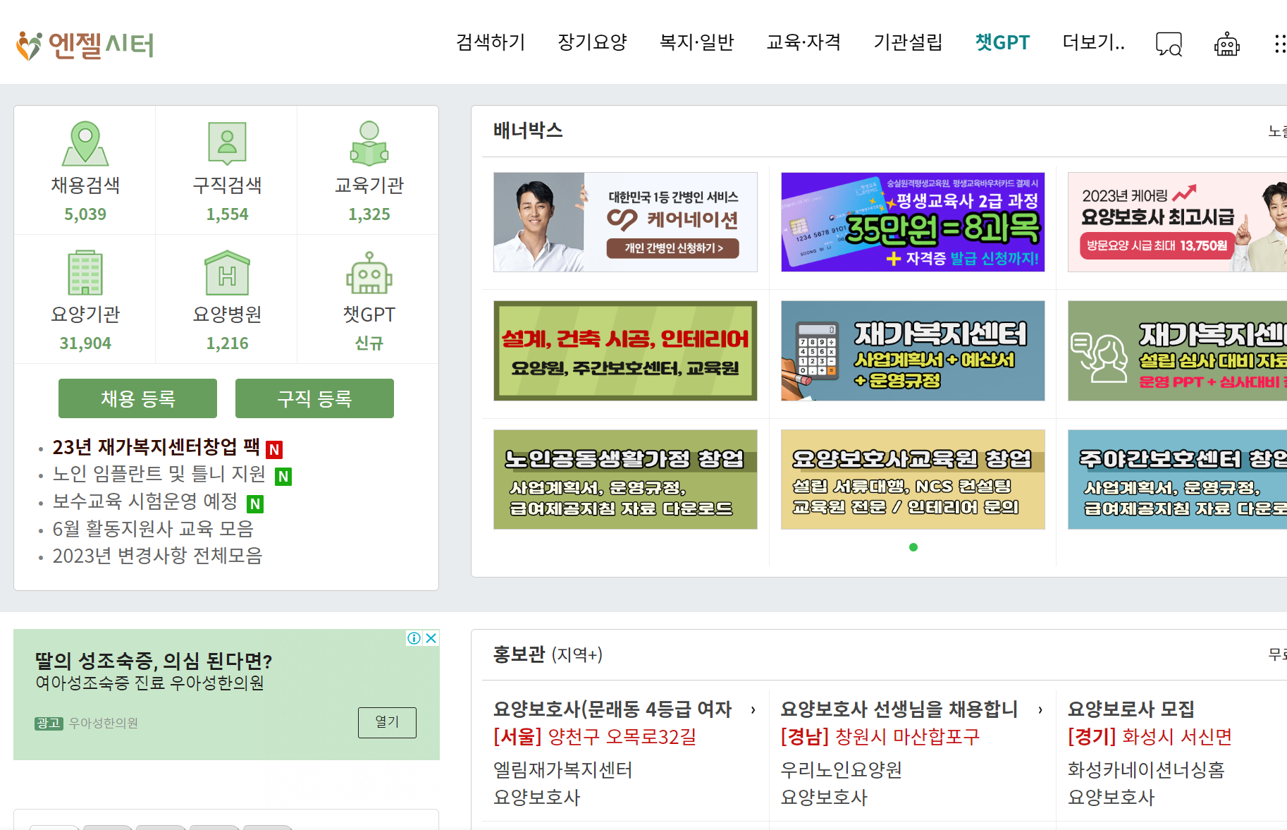 엔젤시터도 요양나라와 비슷한 사이트 중 하나입니다. 다만 시험 등 일정과 관련한 여러가지 정보도 얻을 수 있고 게시판 등도 있어 커뮤니티 성격을 띈다는 장점이 있습니다.