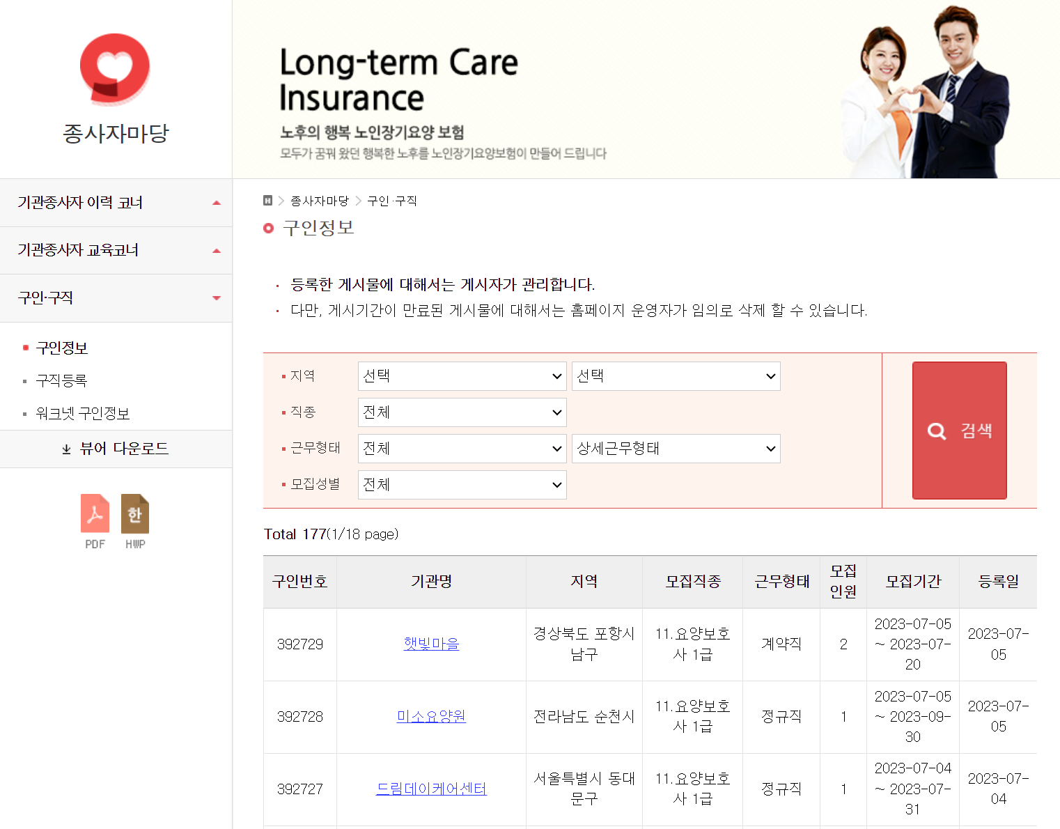 위 버튼을 클릭하시면 아래와 같은 종사자마당 페이지로 이동됩니다. 업체라면 구직을 등록할 수도 있고 구하고 있는 구인 정보 등을 확인 후 지역, 모집직종, 근무형태, 모집 인원 등 모두 확인할 수 있습니다.