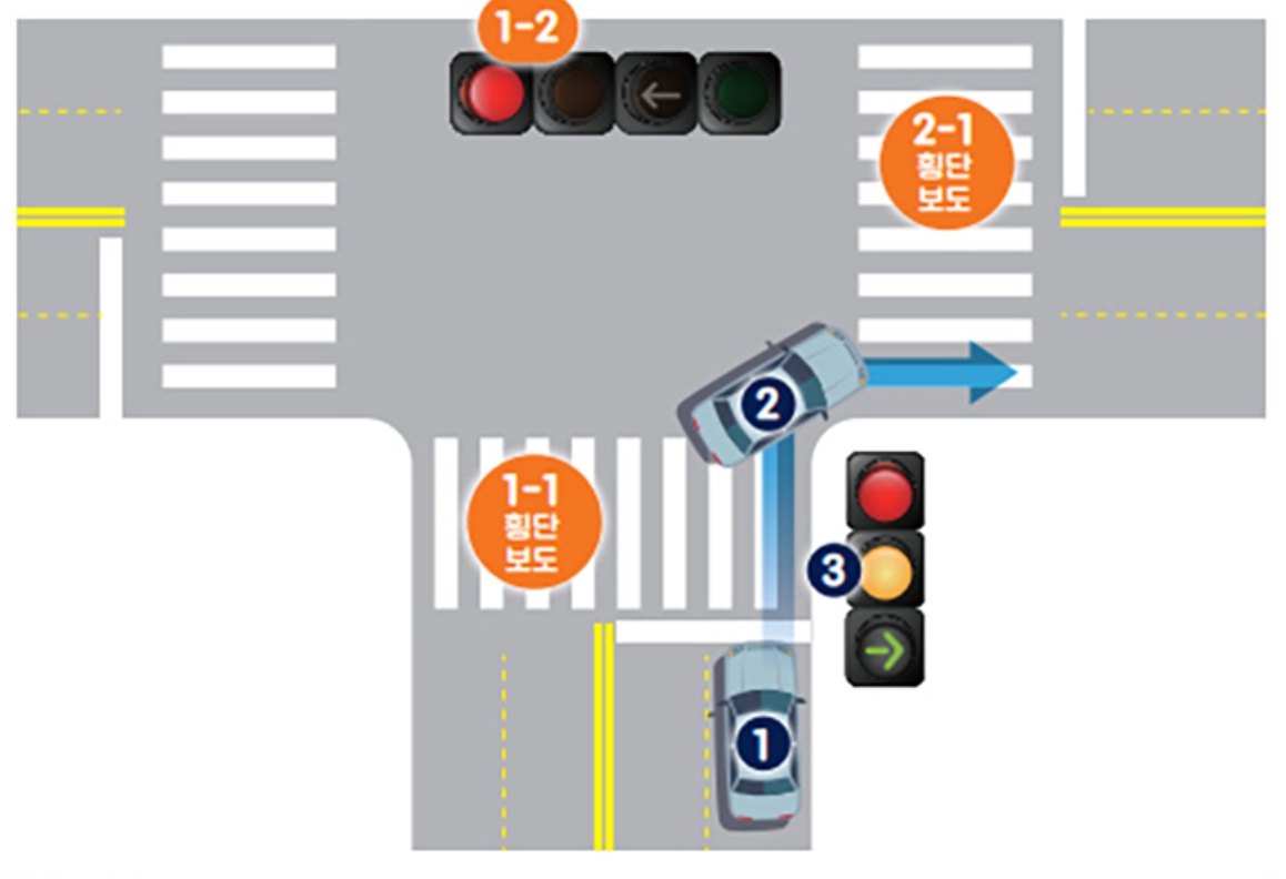 녹색 신호일 경우 서행하여 움직이면 되지만 적색 신호라면 먼저 일시 정지를 해야합니다. 만약 1-1 횡단보도에 통행하려고 하는 보행자가 없을 경우에는 서행하지만 횡단보도에서 통행하고 있는 사람을 발견할 경우 일시 정지 후 서서히 출발합니다.