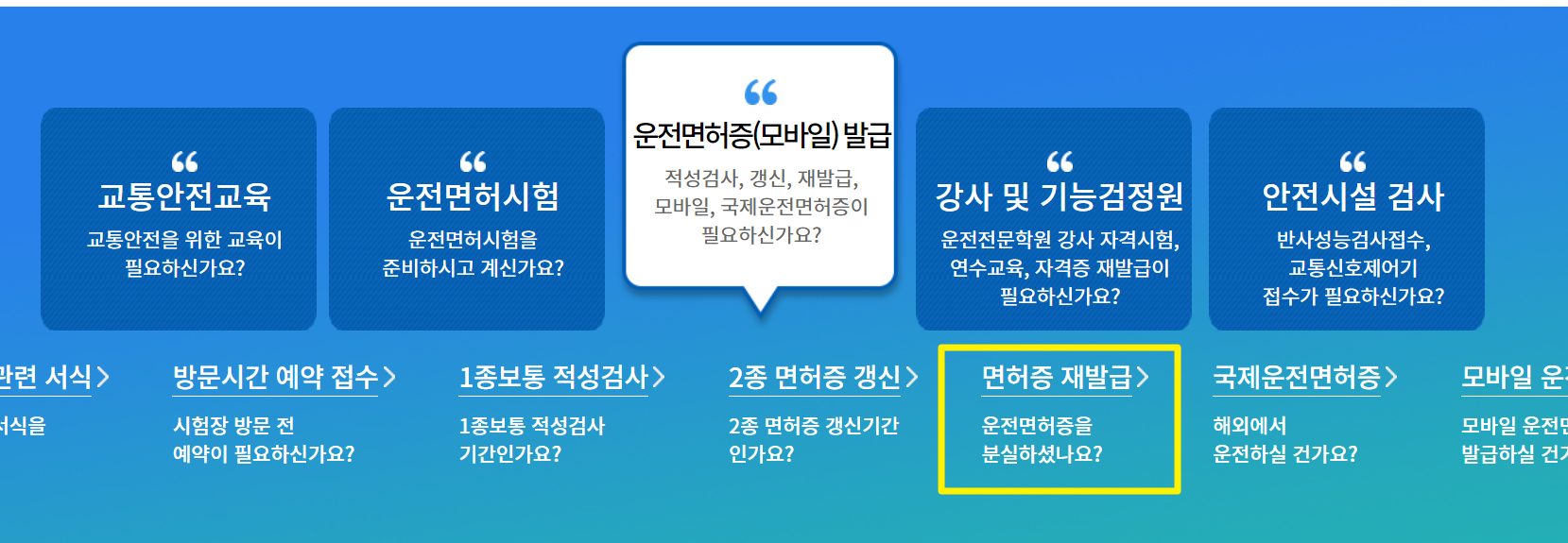 해당 사이트로 이동 하시면 메인 페이지에서 운전면허증 발급 > 면허증 재발급을 클릭하시면 됩니다.