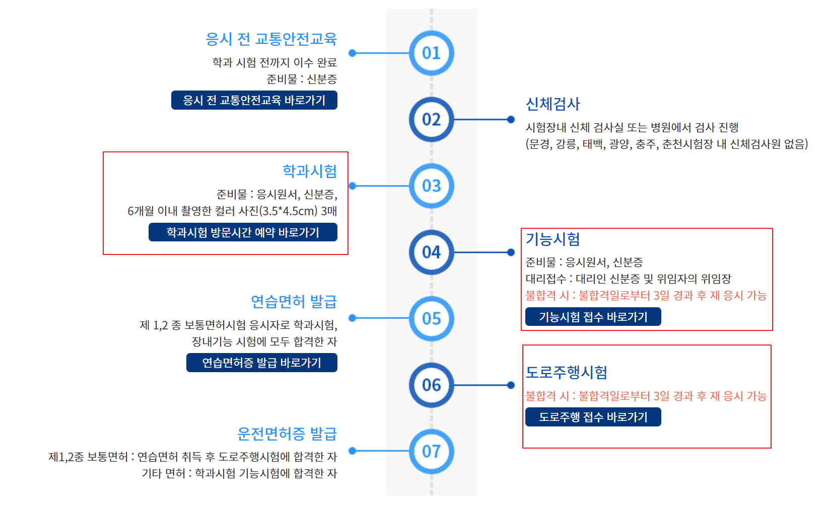 아래는 운전면허를 취득하기 위한 절차인데요, 이미지를 통해 전체적인 프로세스를 한 눈에 익혀보시기 바랍니다.