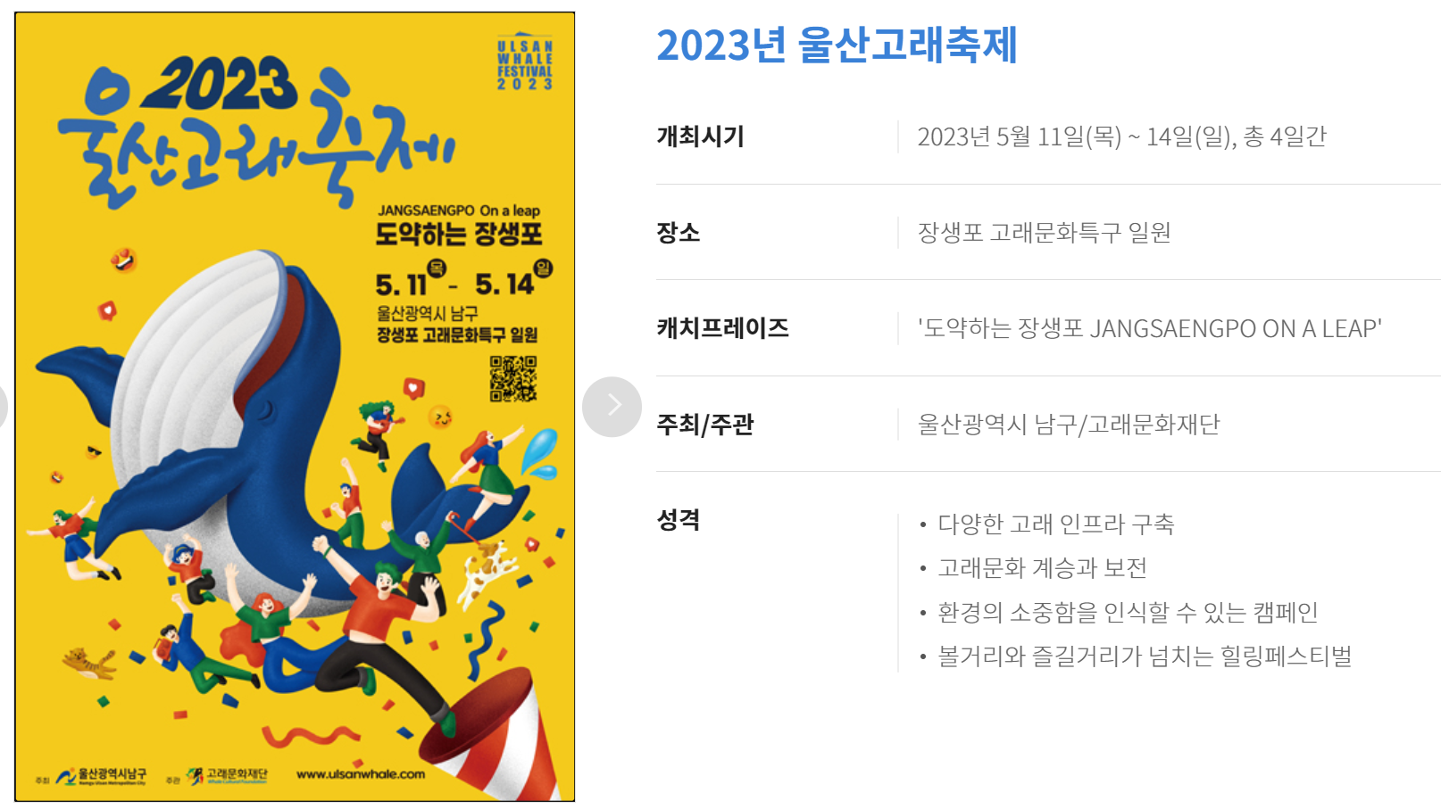 5월 11일부터 총 4일간 진행되며 고래의 역사가 담겨져 있는 고래 박물관, 체험관, 모노레일 등 여러 가지 고래 인프라가 준비될 예정이라고 합니다.