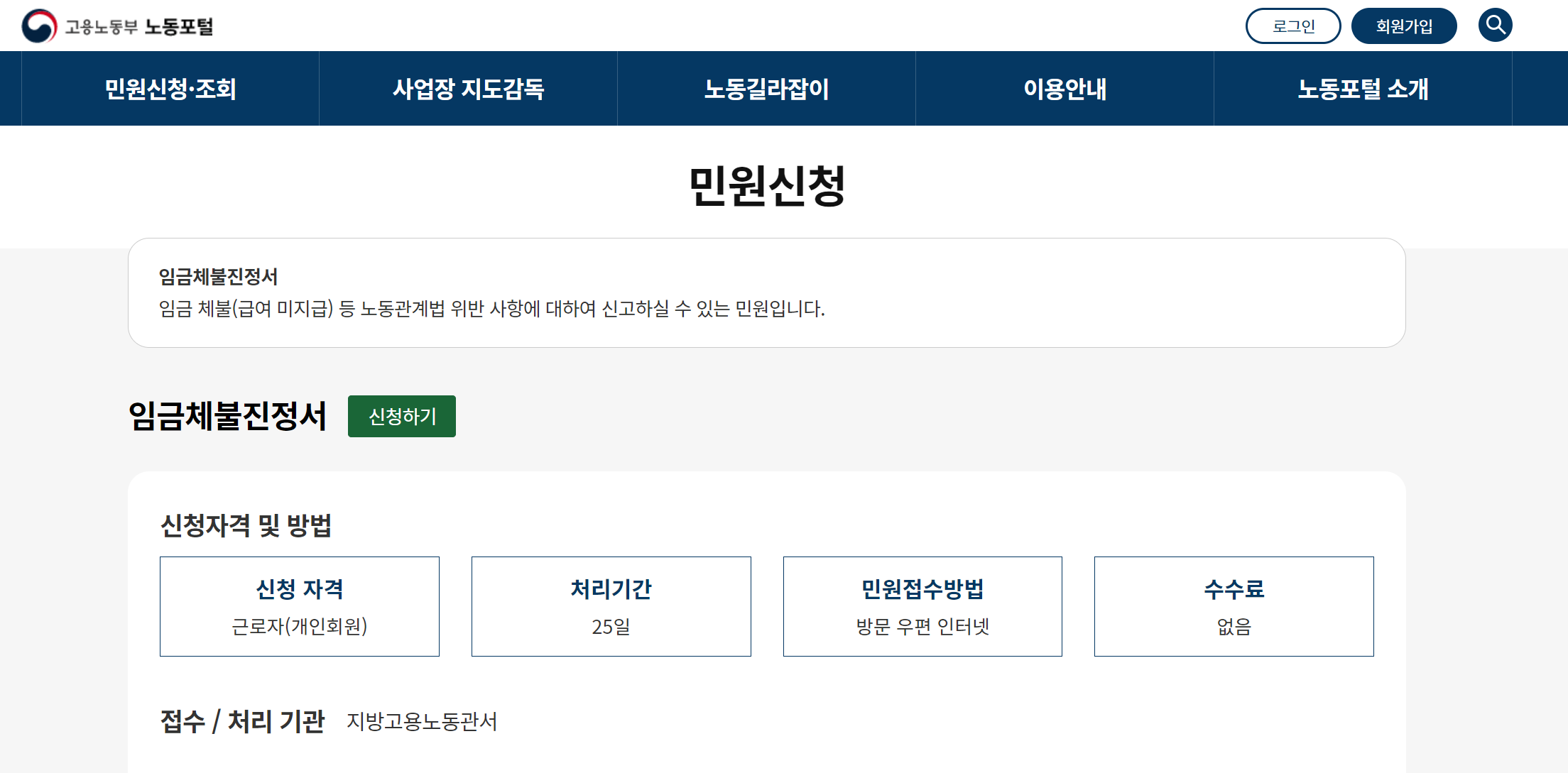 위 버튼을 클릭할 경우 고용노동부 민원마당 홈페이지로 바로 이동합니다. 해당 페이지에서 임금체불진정서 옆 신고하기 버튼을 통해 신청하실 수 있습니다.