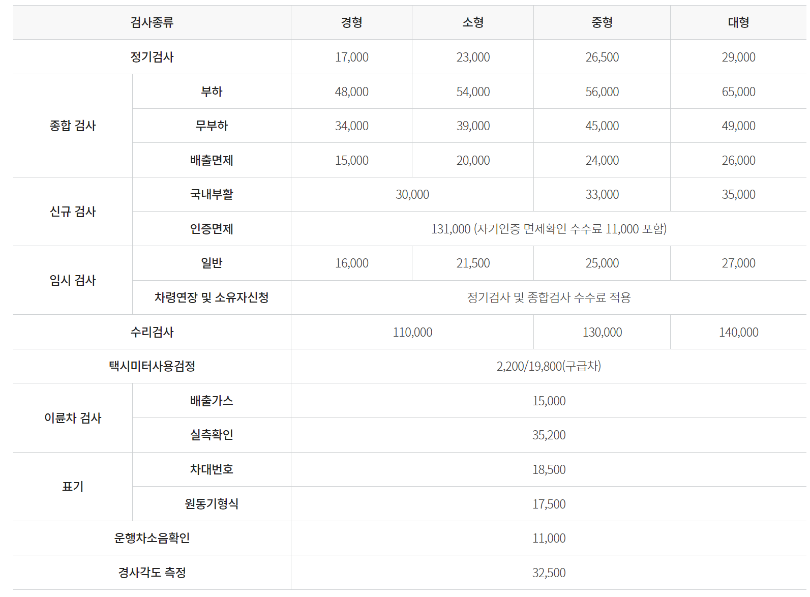 자동차검사를 할 경우 수수료가 들어가는데요, 정기검사의 경우 3만 원이 안 되는 저렴한 편에 속합니다. 아래 표를 참고하시어 내 차량에 맞는 검사비용을 확인해 보시기 바랍니다.