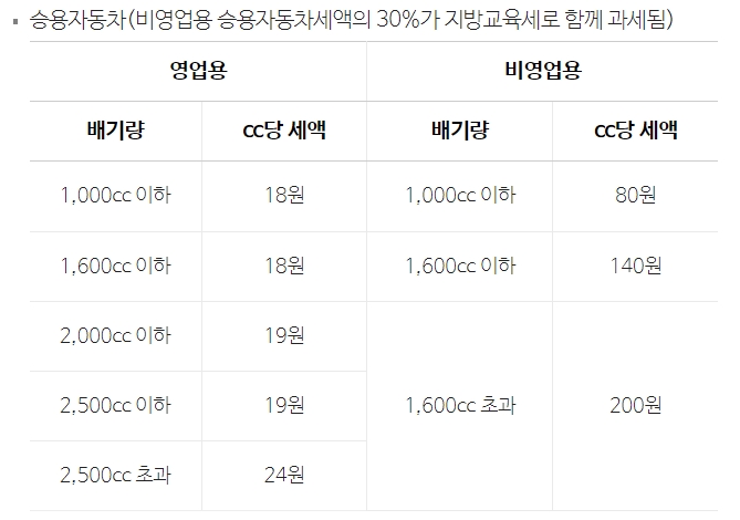 과세표준은 자동차의 배기량으로 승차정원과 적재할 수 있는 적재정량 등으로 구분됩니다. 승용차, 승합차, 화물 자동차 등에 따라 세율이 다르므로 내 차량에 맞는 세율을 아래 표에서 확인해 보시기 바랍니다.