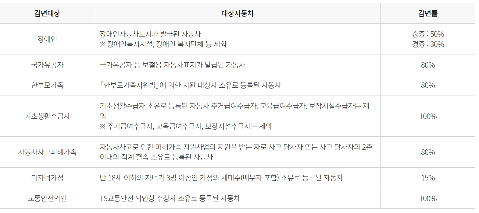 또한 한국교통안전공단 자동차 검사소는 사회공헌의 일환으로 정기검사 수수료를 감면해주기도 합니다. 감면대상자는 전산 확인을 통해 가능하며, 수수료 부과 후 60일 이내에 아래 감면률에 따라 환불해주기도 합니다.
