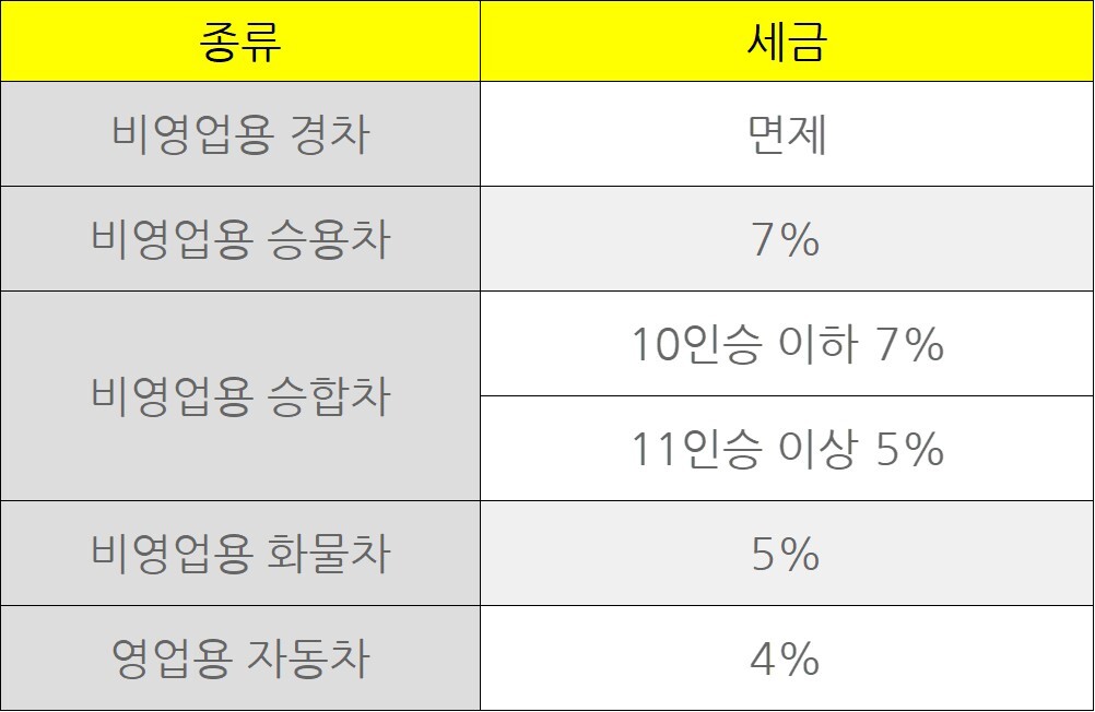 위와 같이 차량 등록세는 영업용이냐 아니냐 그리고 차량의 크기에 따라다소 차이가 있습니다. 보통 비영업용 차량이면서 경차는 면제를 해줍니다.