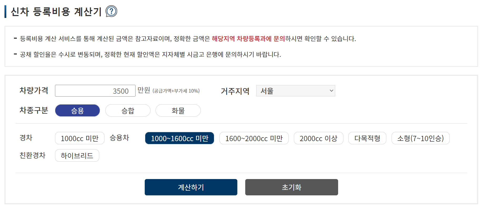 차량 가격을 3500만원으로 입력하고 거주지역을 서울로 입력했습니다. 그외 차종구분과 차량 규모 등을 모두 입력 후 계산하기 버튼을 클릭합니다.