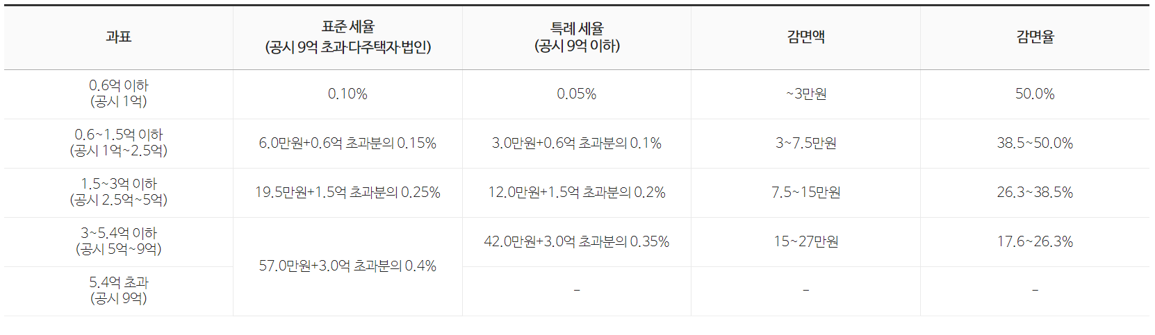 주택의 경우 1가구 1주택의 경우 시가표준액 9억원 이하인 주택의 한하여 아래와 같은 세율을 적용합니다. 공시지가가 9억을 초과하느냐 초과하지않느냐에 따라 표준세율과 특례세율이 적용되는 것을 확인할 수 있으며 과세표준에 따라 감면액 또한 다릅니다.