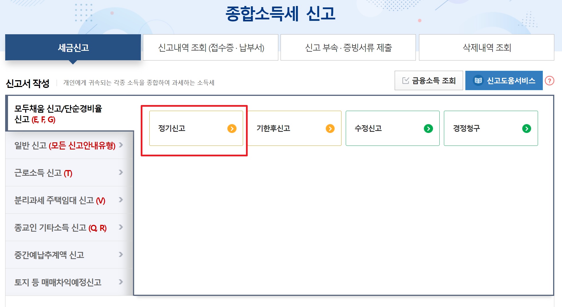 위 버튼을 클릭 하고 종합소득세 신고 페이지로 이동할 경우 아래와 같이 빨간색으로 색인되어 있는 정기신고를 클릭하시면 됩니다.