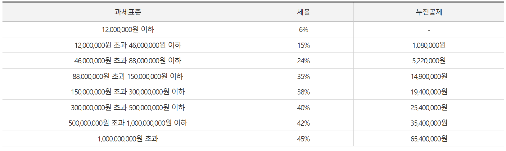 위 세율은 2023년 적용되는 세율이며, 최근 개정된 세율의 경우 2024년부터 적용되는 점 참고하시기 바랍니다. 최근 개정된 세율은 기존보다 과세표준이 완화된 것을 확인할 수 있습니다.
