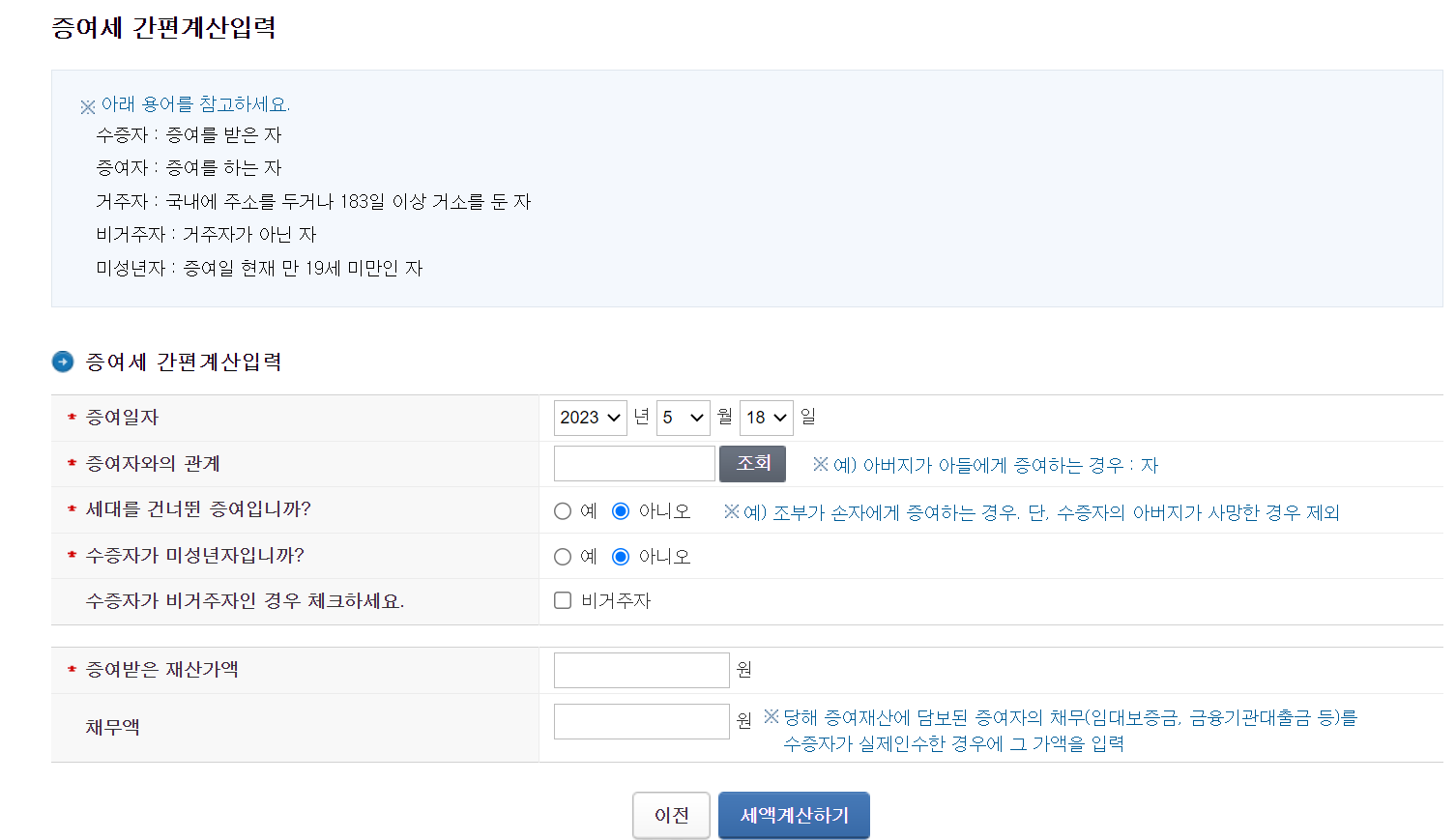 증여세 간편 계산을 선택 후 용어를 참고하시어 기본정보를 기입하여 간편하게 산출할 수 있습니다.