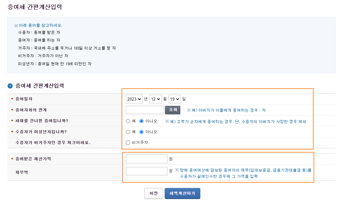 로그인을 하지 않아도 간편하게 이용할 수 있는 증여세 계산기가 있어 이를 이용해보았습니다. 내가 증여받은 날짜, 그리고 관계 등 개인 정보등을 입력 후 과세표준이 되는 증여받은 재산가액을 입력해줍니다.