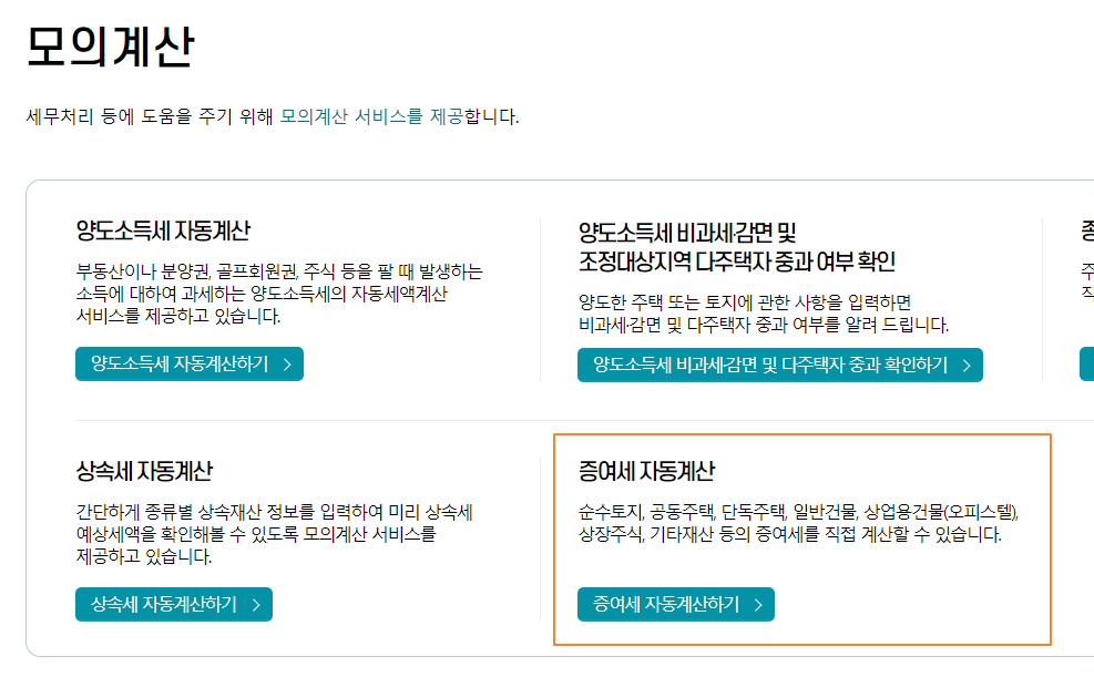 꼭 현금으로만 증여되는 것이 아니기 때문에 이러한 모의계산을 통해 어느정도의 증여세가 나오는지 알아두는 것이 좋습니다. 아래 영역에서 '증여세 자동계산'을 클릭해줍니다.