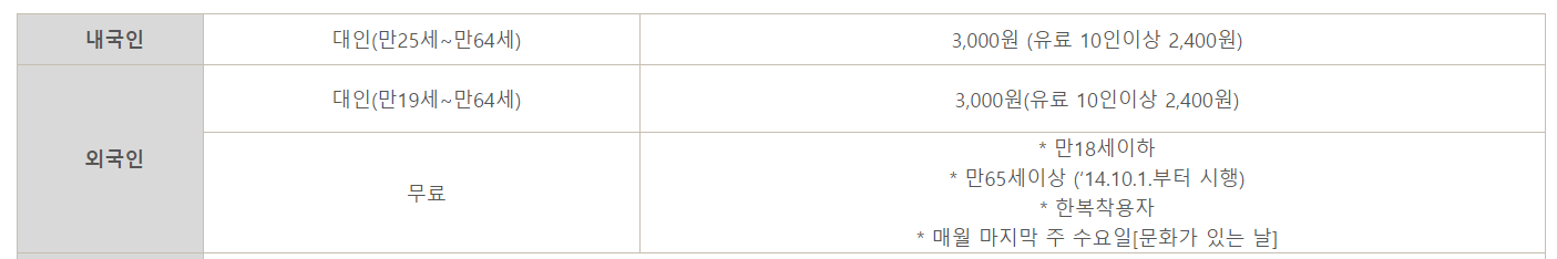 만 6세 어린이 또는 한복을 착용할 경우 무료로 입장하실 수 있습니다. 다만 후원 관람 해설의 경우 만 19세 이상일 경우 5천 원, 그리고 만 7세 ~ 만 18세의 경우 2,500원의 관람 해설 비용이 있습니다. 단순 입장의 경우 아래 요금을 확인하시면 됩니다.