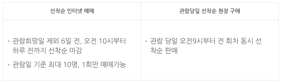보통 관람희망일을 제외한 6일 전 오전 10시에 하루 전까지 선착순으로 마감되는데요, 온라인으로 선착순에 들지 못했을 경우 관람 당일 오전 9시부터 전 회차 동시에 선착순으로도 입장권이 판매되는 점 참고하시어 관람하시기 바랍니다.