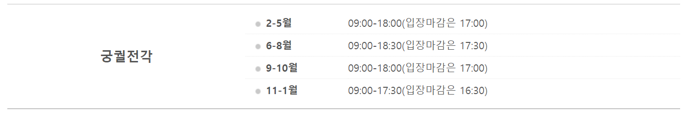 오전 9시부터 각 계절에 따라 입장 마감시간 및 관람 종료 시간이 다른 점 참고하시기 바랍니다. 또한 휴관일이 매주 월요일이기 때문에 이 점 참고하시어 관람하시기 바랍니다.