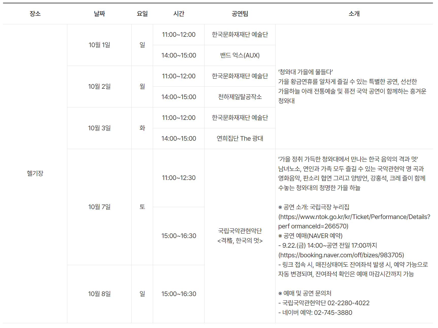 매월 변경되는 공연 프로그램으로 매번 다채로운 청와대 관람을 할 수 있습니다. 10월에는 아래와 같은 공연 프로그램이 준비되어있으며, 아래 버튼을 통해 신청해보시기 바랍니다.