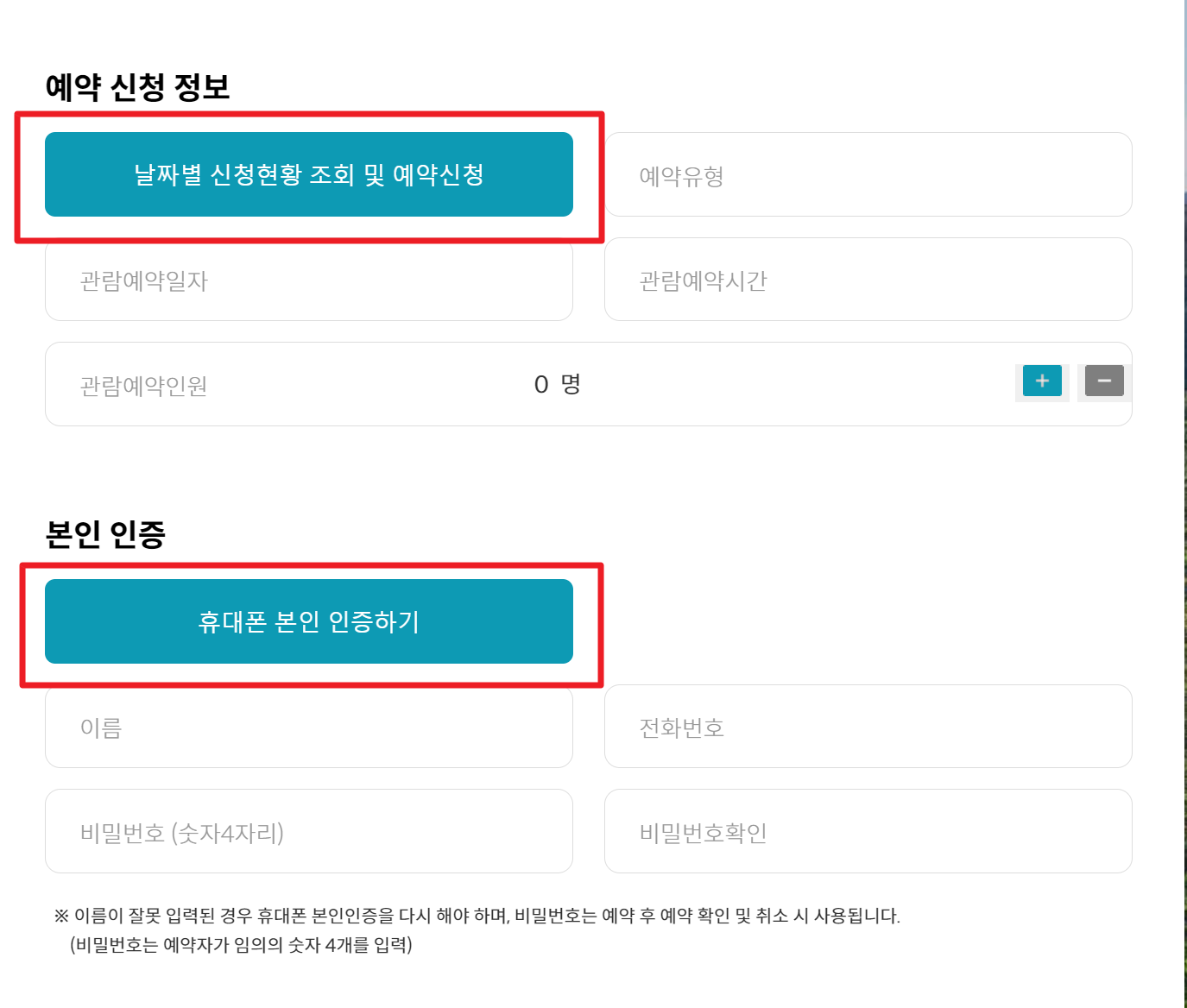 예약을 위해서는 먼저 위 버튼을 통해 예약 사이트로 이동하셔야 합니다. 해당 사이트에서 예약 신청 정보와 본인인증 절차를 거친 후 동의 클릭하여 청와대 관람신청을 간편하게 예약할 수 있습니다.
