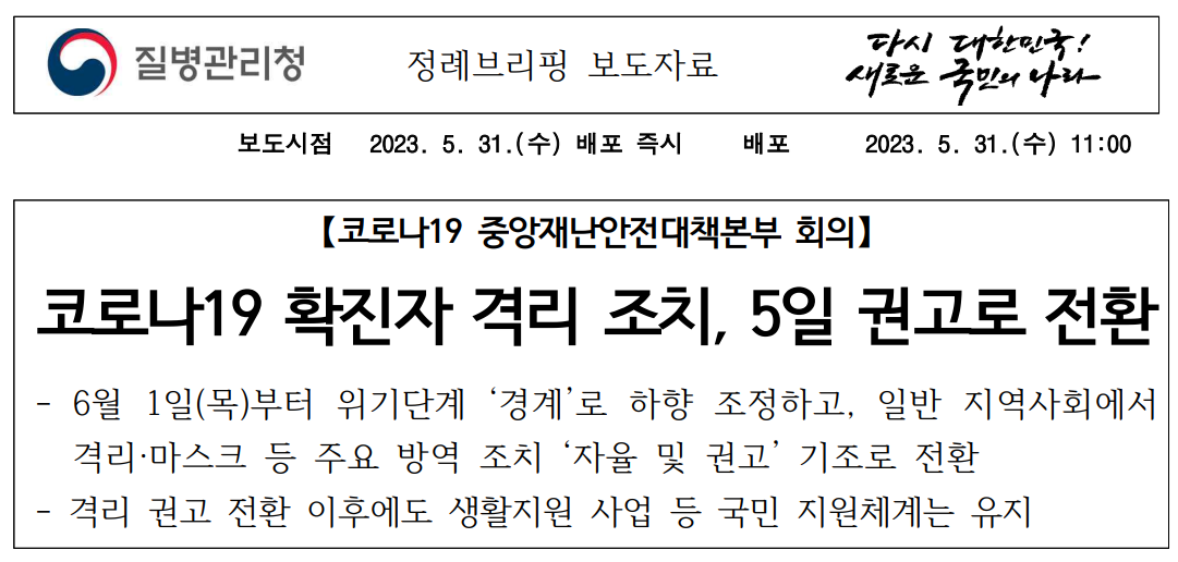 코로나 19 중앙재난안전대책본부에서는 5월 31일 아래와 같은 보도자료를 배포했는데요, 이제 격리를 필수적으로 하지 않아도 되는 것입니다.