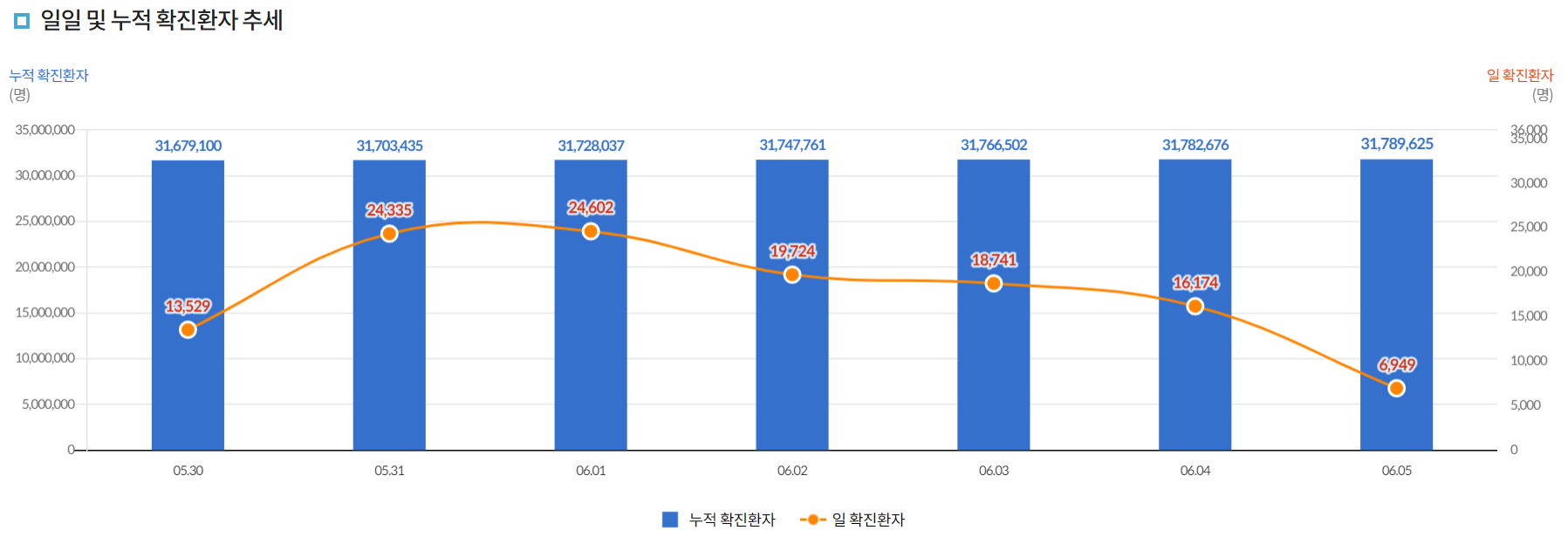 온 국민 중 반 이상이 걸려 누적 확진환자는 3천만 명이 넘는 것을 볼 수 있습니다. 다만 일 확진자 수가 6월 5일 기준으로 7천 명 이하로 떨어진 모습을 확인할 수 있습니다.