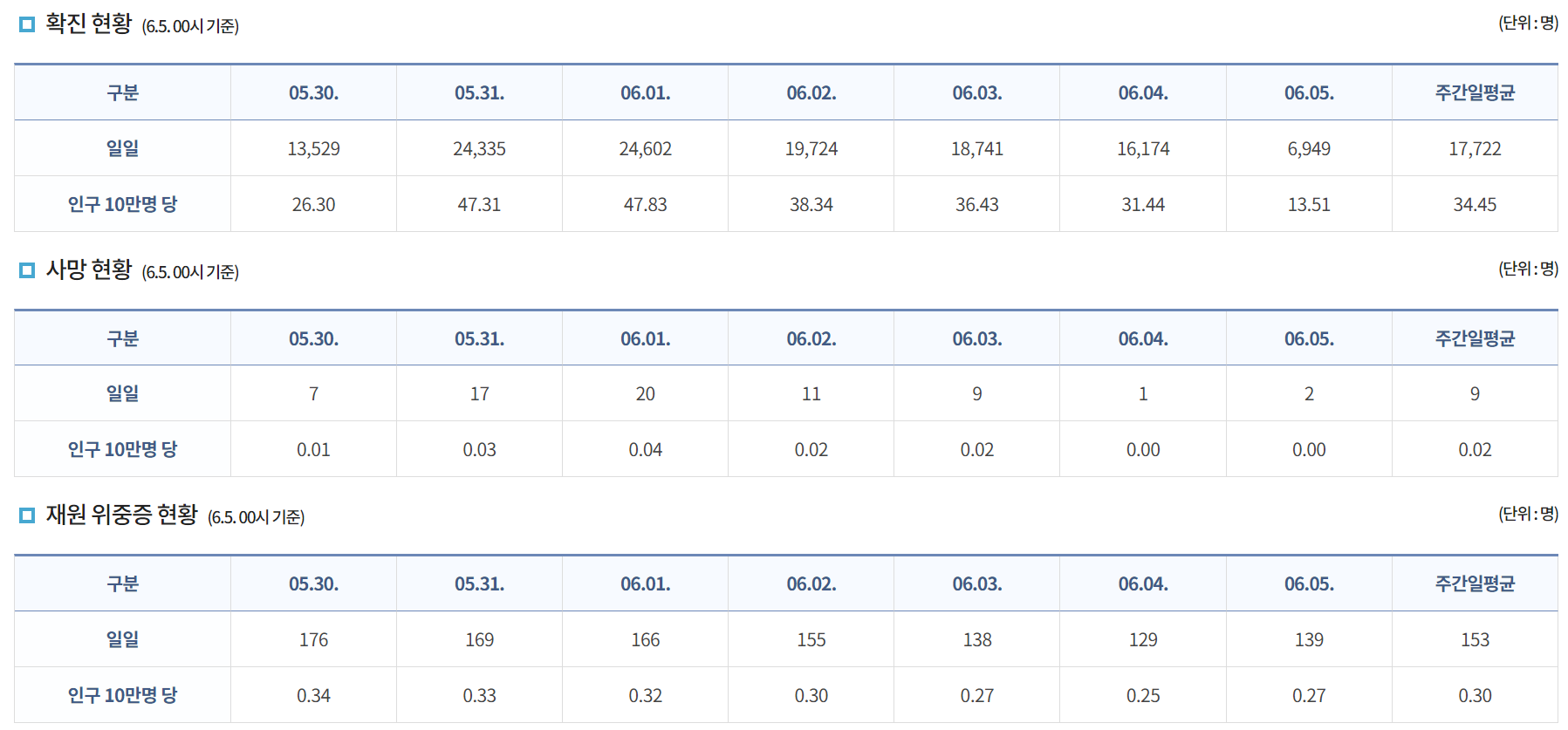 아래 표는 6월 5일 00시 기준 코로나 바이러스 감염증 국내 발생현황이며 현재까지 매일 1~20명 정도의 사망자가 있습니다. 다만 코로나 위중증 현황도 예전에 비하면 많이 감소한 것으로 확인됩니다.